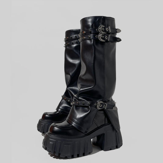 Black Buckle Strap Platform Combat Boots with Red Laces