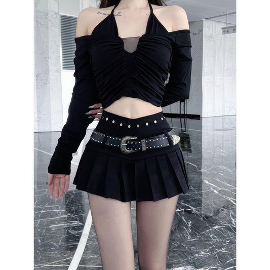Pleated Mini Skirt with Studded Belt