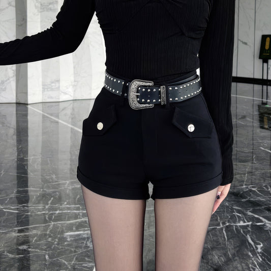 Studded Belted High Waist Black Shorts