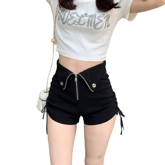 Front Zip V-Waist Ruched Black Shorts