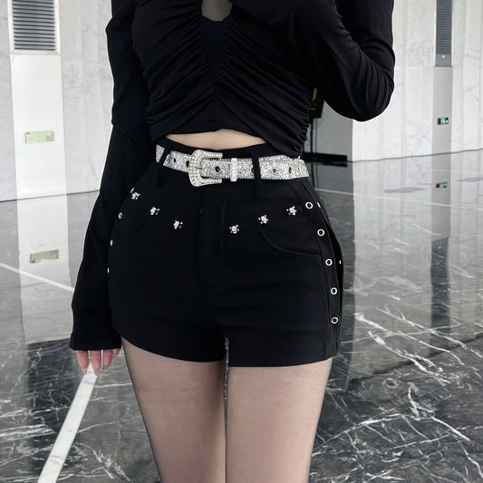 Rhinestone Grommet Belted Black Shorts