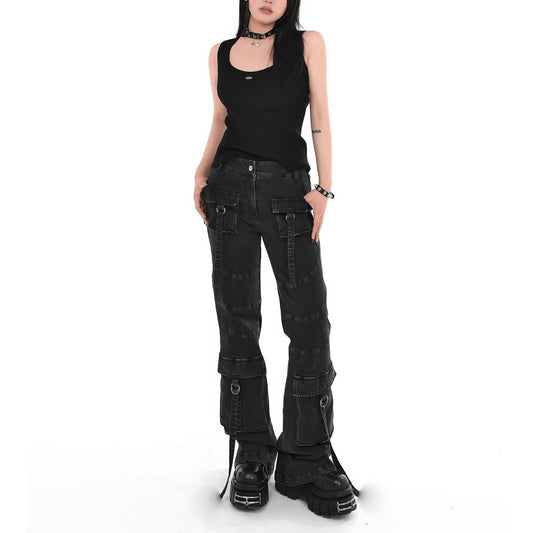 Washed Strap Cargo Flare Jeans