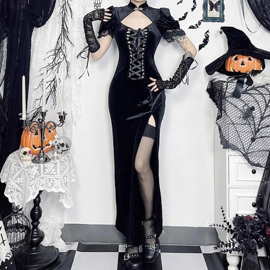 • Velvet Lace-Up Slit Cheongsam Dress
