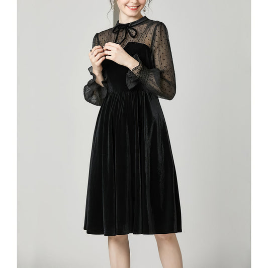 Velvet Mesh Dot Sleeve Black Midi Dress
