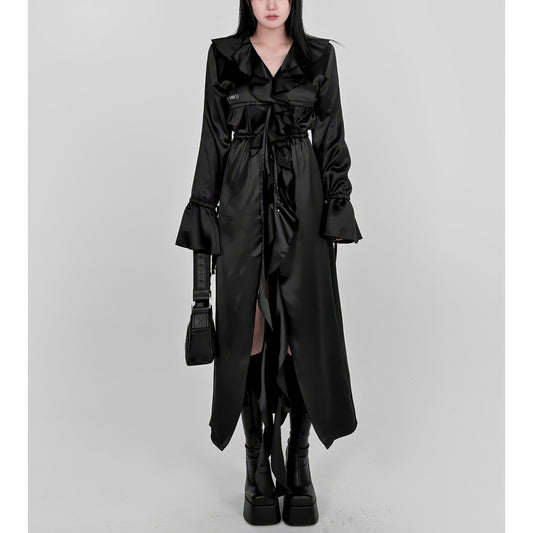 • Satin Ruffle Belted Long Dress