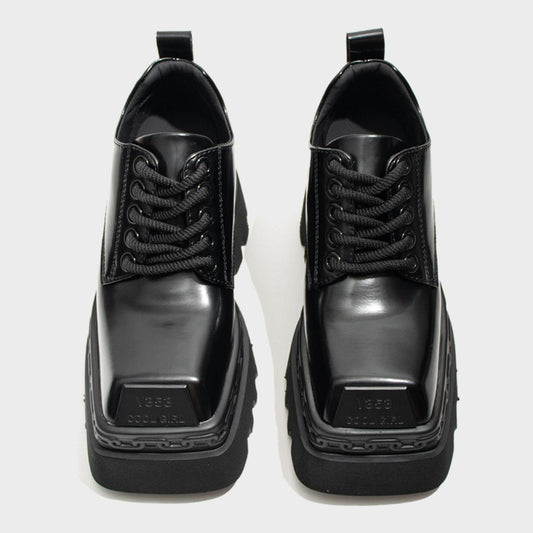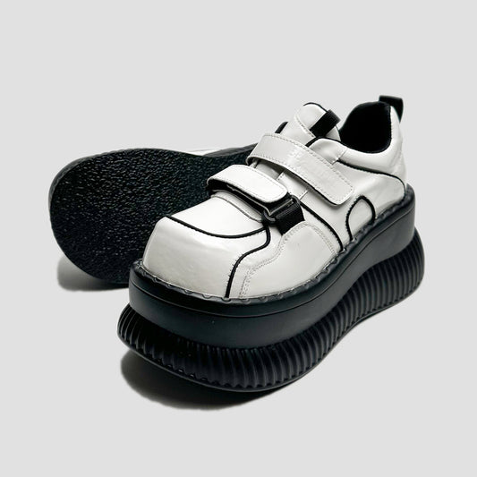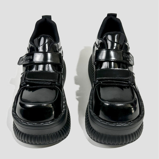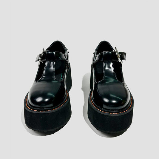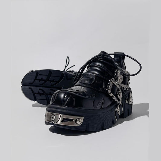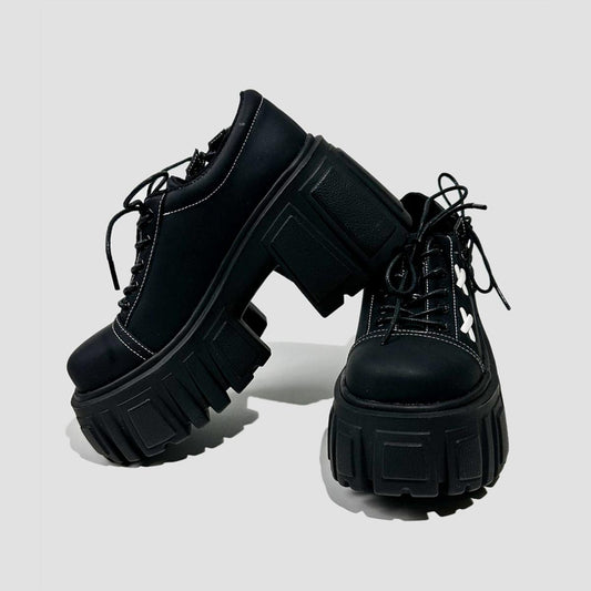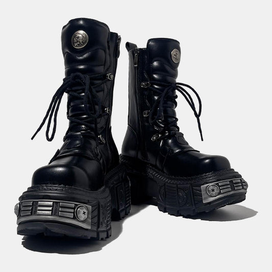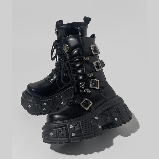 Black Buckle Strap Platform Combat Boots with Red Laces