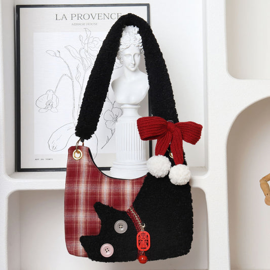 Plaid Fleece Cat Accent Mini Shoulder Bag