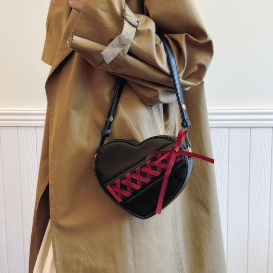 Ribbon Lace-Up Heart Faux Leather Shoulder Bag