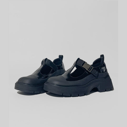 • Black Patent Chunky T-Strap Shoes