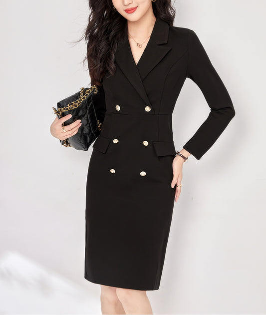 • Double-Breasted Blazer Style Black Midi Dress