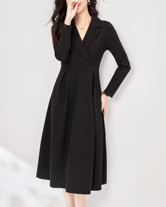 • Pleated Lapel Collar Black Midi Dress