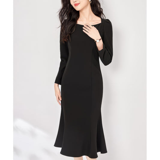 • Boat Neck Long Sleeve Flared Black Midi Dress