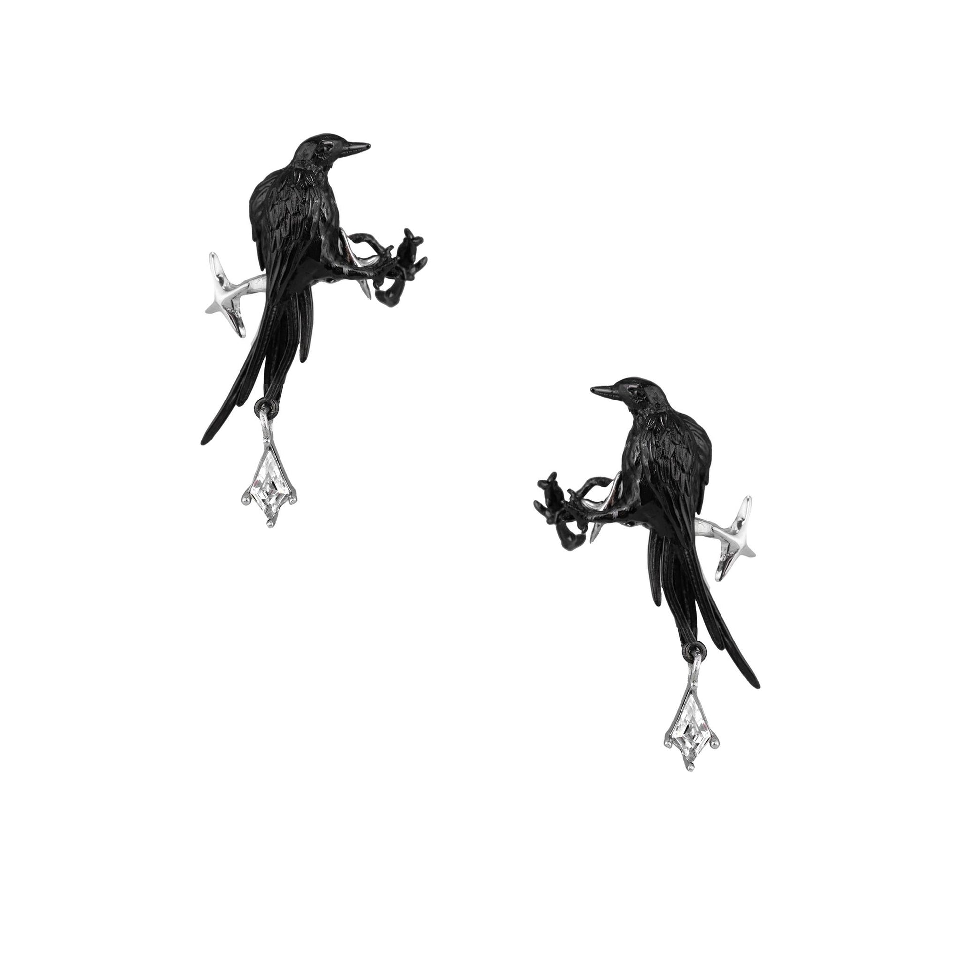 • Intricate black bird design perched on a branch with dangling gem detail.