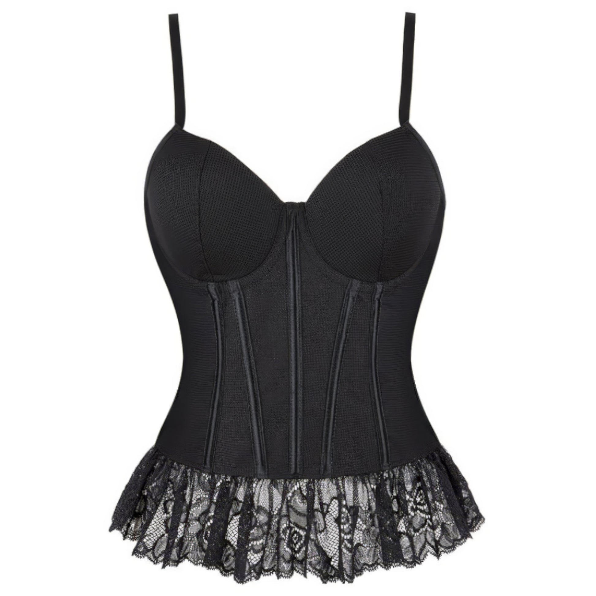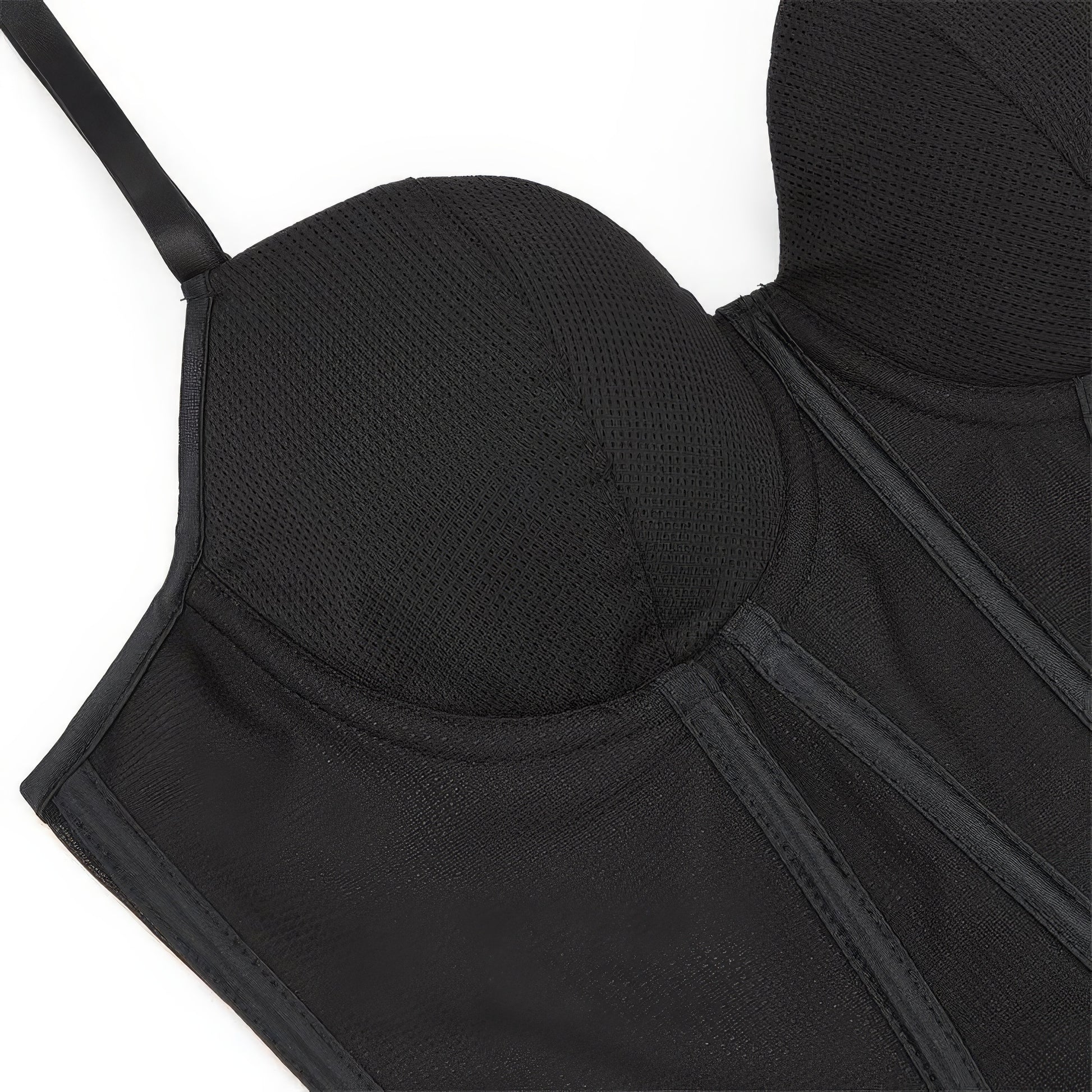 • Sheer mesh body with boning adds structure while remaining breathable.