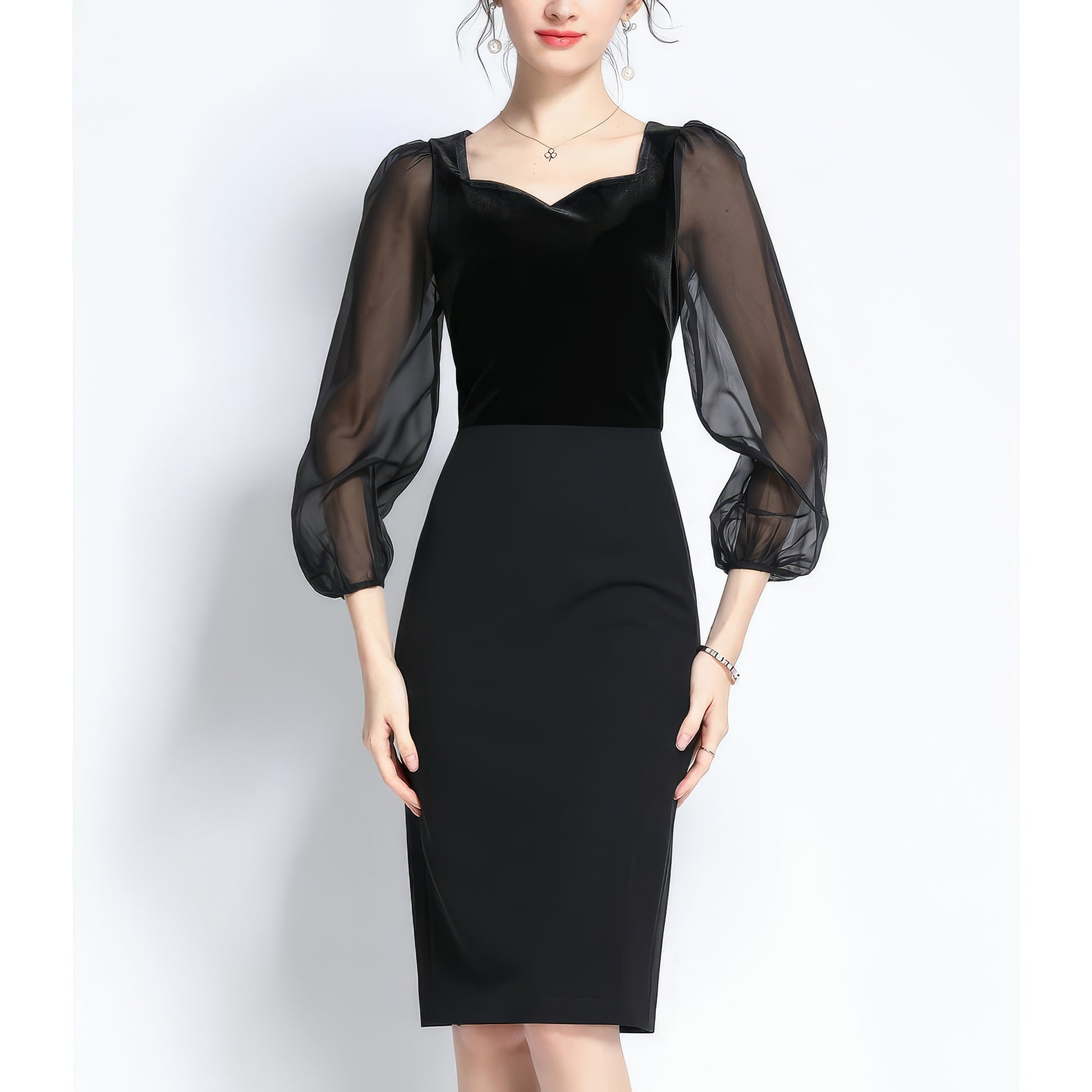 Velvet Sheer Sleeve Sweetheart Pencil Dress